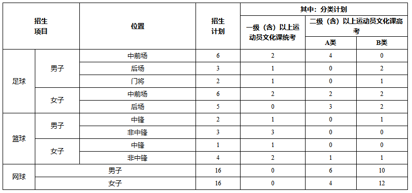 招生计划:不超过64名,各项目、位置招生计划如下表所示。表中各项目、位置招生计划及分类计划均为上限值,根据实际考核情况,择优录取,宁缺毋滥。